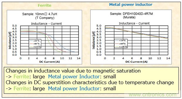 同等特性時(shí)(感值、飽和電流等),金屬合金功率電感比鐵氧體功率電感的外形尺寸小50%左右,可以實(shí)現(xiàn)小型化和薄型化。