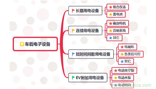 作為電動(dòng)汽車(chē)的供電設(shè)備,DC/DC變換器也給車(chē)載電子設(shè)備供電。根據(jù)純電動(dòng)汽車(chē)車(chē)載電子設(shè)備不同屬性,可把用電設(shè)備分為長(zhǎng)期用電設(shè)備、連續(xù)用電設(shè)備、短時(shí)間間歇用電設(shè)備和EV附加用電設(shè)備等四種類(lèi)型,如下圖所示。同時(shí),DC/DC變換器的體積和種類(lèi)都很小且輸出穩(wěn)定。