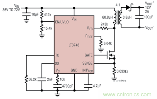 圖 1:采用主端輸出電壓檢測(cè)的 LT3748 反激式轉(zhuǎn)換器。