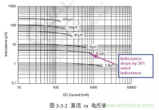 電感的飽和電流I(SAT)指其感值下降了標(biāo)稱值的10%~30%所能通過的最大電流。如圖3-3-2所示,4.7uH電感下降為3.3uH時的電流約為900mA,因此其I(SAT)(30%)是900mA。