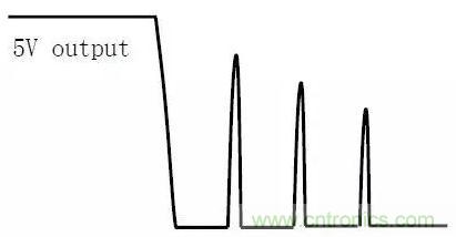 在輸出空載或輕載時,關閉輸入電壓,輸出(如5V)可能會出現(xiàn)如下圖所示的電壓反跳的波形。