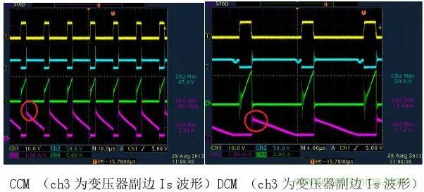 1)變壓器初級電流,CCM模式是梯形波,而DCM模式是三角波。