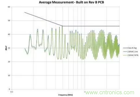 圖4是修改后的效果圖。我們在故障點(diǎn)位置為EMI規(guī)范獲得了大約6dB的裕量。此外,我們還顯著減少了總體EMI簽名。所有這些改善都僅僅是因為布局的調(diào)整,并未改變電路。如果您的電路具有高電壓開關(guān)并使用了屏蔽距離,您需要非常小心地對其進(jìn)行控制。