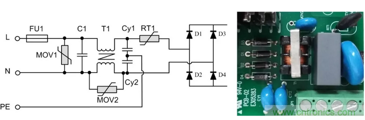 背景:以某型號的電源模塊為例,該模塊是ZLG致遠(yuǎn)電子為某客戶定制的電源模塊,輸入85VAC~350VAC,且EMC前級電路電路嵌入到模塊中??估擞恳蟛钅k妷?KV,共模電壓6KV。更換更大的保險絲后可承受6KV差模電壓。其前級原理圖及對應(yīng)實物圖如圖2所示。