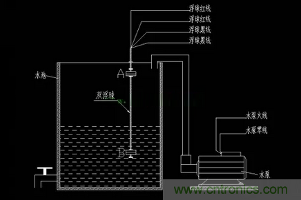 2、當(dāng)水位漲到A、B處限位開(kāi)關(guān)之間時(shí),B處開(kāi)關(guān)斷開(kāi),A處開(kāi)關(guān)仍然是閉合狀態(tài),此時(shí)線圈被自鎖得電,水泵繼續(xù)運(yùn)行;