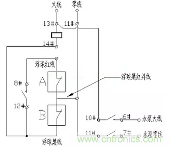上圖中,6#與10#、7#與11#、8#與12#是繼電器常開(kāi)觸點(diǎn),13#與14#繼電器線圈觸點(diǎn),A和B分別是雙浮球的上下限位開(kāi)關(guān)。該電路只有當(dāng)水位下降至最低限位之后才會(huì)工作。