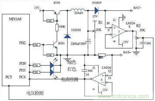 本系統(tǒng)主要有微控制器、電壓檢測(cè)電路、電流檢測(cè)電路、電池狀態(tài)指示電路和充電控制電路組成,電路原理圖如圖所示。