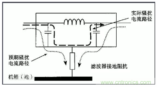許多設(shè)備的電源線進(jìn)入機(jī)箱后,經(jīng)過(guò)很長(zhǎng)的導(dǎo)線才接到濾波器的輸入端。例如,電源線從機(jī)箱后面板輸入,走行到前面板的電源開(kāi)關(guān),又回到后面板接到濾波器。或者濾波器的安裝位置距離電源線入口較遠(yuǎn),造成引線太長(zhǎng)(如圖1所示)。