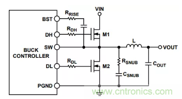 在DH或DL引腳上串聯(lián)一個小電阻(約2 Ω至4 Ω)可以減慢柵極驅(qū)動,從而也能降低柵極噪聲和過沖。另外,BST與SW 引腳之間也可以連接一個電阻(參見圖6)。在布局期間用0 Ω柵極電阻保留空間,可以提高日后進行評估的靈活性。增加的柵極電阻會延長柵極電荷上升和下降時間,導(dǎo)致 MOSFET的開關(guān)功率損耗提高。