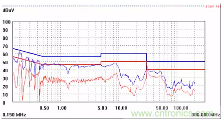 圖一a可以看出,改變PCB布局后130M-200M已經(jīng)完全被衰減,但是30-130M沒(méi)有圖一效果好,可能變壓器出線無(wú)交叉好一些。仔細(xì)觀察,此IC具有抖頻功能,傳導(dǎo)部分頻段削掉了一些尖峰;