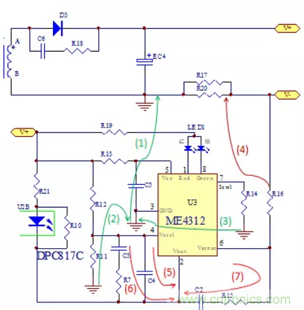如(1)(2)(3)綠線所示,R11的地和R14的地連接到芯片的地,再連接到EC4電解電容的地。注意不可連到變壓器的地,因?yàn)樽儔浩鞔渭?jí)A->D3->EC4->次級(jí)B形成功率環(huán),如果ME4312芯片的地接到次級(jí)B線到EC4電容之間,受到較強(qiáng)的di/dt干擾會(huì)導(dǎo)致系統(tǒng)的不穩(wěn)定等因素。