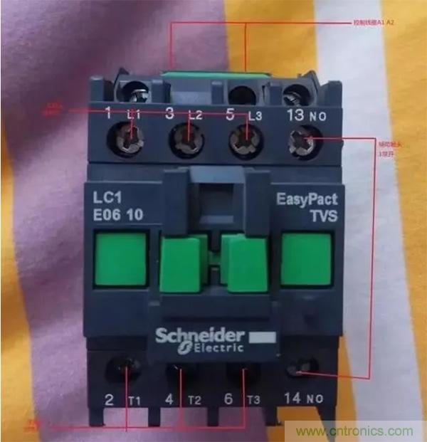 如上圖所示,接觸器共有六個(gè)主觸點(diǎn),1,3,5為主觸點(diǎn)進(jìn)線孔,2,4,6為主觸點(diǎn)出線孔,A1,A2為接觸器