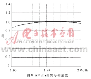 得到了完整的電路PCB板后,就要實際測量電路的各個參數(shù),驗證設(shè)計的仿真結(jié)果是否與之相符,是否最終符合表1的設(shè)計技術(shù)規(guī)范。本文所采用的測試儀器是HP8753ES網(wǎng)絡(luò)分析儀和HP8970B噪聲儀。圖8、圖9表達出放大器實測的NF和增益曲線,在帶寬為0.1GHz的頻率范圍內(nèi)NF的值在0.8dB和1.0dB之間,增益在1.97GHz達到最大值15.5dB,在1.99GHz達到了15.3dB。由于NF是在實際PCB板外腔體內(nèi)測得的,包含了同軸連接器的損耗和二級噪聲損耗,其測量指標表明實際的電路NF特性要稍差于模擬特性。圖10是輸入、輸出的回波曲線。當頻點在1.96GHz時,輸入回波為18dB,輸出回波達到22.5dB,放大器的OIP3在直流偏置Vds=3V,Id=60mA時測得值為37dBm,P1dB為21.4dBm。電路在較低的偏置狀態(tài)下Vds=3V,Id=40mA放大器的NF和增益都沒有降低,只有OIP3測出下降為36.5dBm。