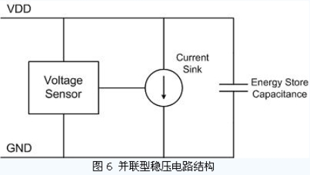在輸入信號(hào)幅度較高時(shí),電源穩(wěn)壓電路必須能保證輸出的直流電源電壓不超過(guò)芯片所能承受的最高電壓;同時(shí),在輸入信號(hào)較小時(shí),穩(wěn)壓電路所消耗的功率要盡量的小,以減小芯片的總功耗。