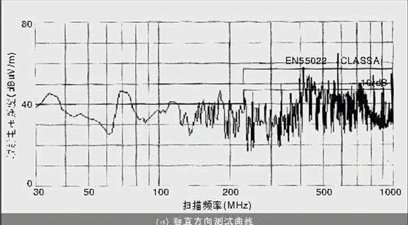 測(cè)試環(huán)境為電波暗室,測(cè)試設(shè)備為寬帶天線、頻譜分析儀和信號(hào)放大器,天線可以在1 m與4 m高度范圍內(nèi)升降,被測(cè)產(chǎn)品放置在一個(gè)可360°旋轉(zhuǎn)的平臺(tái)上,距離天線3 m。測(cè)量時(shí)轉(zhuǎn)動(dòng)平臺(tái),升降天線找到最大干擾,天線測(cè)量取水平和垂直兩種極化。