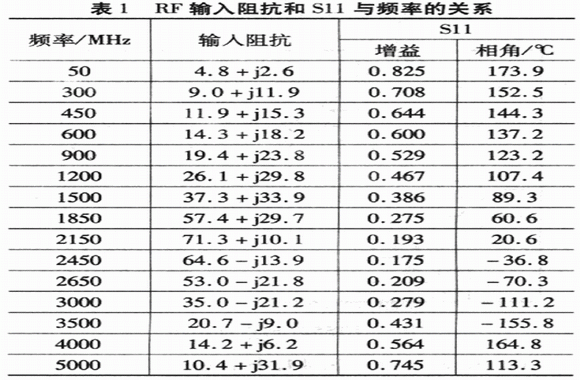 在400 MHz低頻處或3.7GHz處,RF輸入匹配網(wǎng)絡在原有基礎上增加并聯(lián)電容器C5,如果450MHz下的輸入匹配電容器C5的容值為12 pF,在評估板的50 Ω輸入傳輸線上,位于距離引腳34.5 mm的位置;900 MHz下的輸入匹配電容C5=3.9 pF,位于距離引腳3 1.3 mm的位置;3.5 GHz下的輸入匹配電容器C5=O.5 pF,位于距離引腳34.5mm的位置。這種串聯(lián)傳輸線/并聯(lián)電容器匹配拓撲使得LT5527可用于倍頻標準,而不需要修正電路板的設計。串聯(lián)傳輸線可用串聯(lián)的片式電感器代替,以使布局更簡單。RF輸入阻抗和Sl1與頻率的關系(沒有外部匹配)列于表1。S11數(shù)據(jù)用于微波電路模擬設計自定義匹配網(wǎng)絡,模擬和RF輸入濾波器的接口連接。