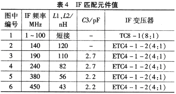 該匹配網(wǎng)絡對40MHz以上(包括40MHz)的IF最為合適。對于40 MHz以下的IF頻率,若串聯(lián)電感器(Ll、L2)的電感值取得過高,用這樣的電感和寄生效應將影響穩(wěn)定性,因此,8:1變壓器適合于低IF頻率。適用于 IF頻率的低通濾波的匹配元件值如表4所示。高Q值線繞片式電感器(Ll、L2)大大改善了混頻器的轉換增益,但對線性度還是有點影響。
