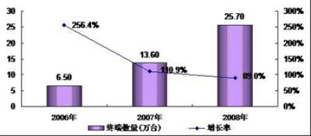 圖1 2006-2008年中國(guó)車(chē)載公交移動(dòng)電視終端發(fā)展及增長(zhǎng)率
