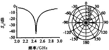 半波偶極子天線模型如圖4a所示.天線采用銅材料(電導(dǎo)率:5.8e7s/m,磁導(dǎo)率:1),位于充滿空氣的立方體中心.在立方體外表面設(shè)定輻射吸收邊界.輸入信號(hào)由天線中心處饋入,也就是RFID芯片的所在位置.對(duì)于2.45GHz的工作頻率其半波長(zhǎng)度約為61mm,設(shè)偶極子天線臂寬w為1mm,且無限薄,由于天線臂寬的影響,要求實(shí)際的半波偶極子天線長(zhǎng)度為57mm.在AnsoftHFSS工具平臺(tái)上,采用有限元算法對(duì)該天線進(jìn)行仿真,獲得的輸入回波損耗S11分布圖如圖5a所示,輻射場(chǎng)E面(即最大輻射方向和電場(chǎng)矢量所在的平面)方向圖如圖5b所示.天線輸入阻抗約為72Ω,電壓駐波比(VSWR)小于2.0時(shí)的阻抗帶寬為14.3%,天線增益為1.8.