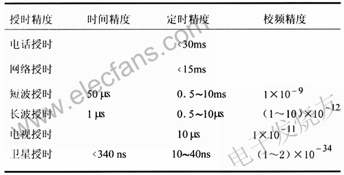 衛(wèi)星授時GPS導(dǎo)航系統(tǒng):提供的時間信號對世界協(xié)調(diào)時跟蹤,精度優(yōu)于100ns。GPS全球覆蓋,接收設(shè)備體積小,可以接收6顆衛(wèi)星信號,可用來提供2.048Mbit/s基準(zhǔn)時間信號。俄羅斯的GLONASS衛(wèi)星導(dǎo)航系統(tǒng):目前系統(tǒng)未完成完善,接收設(shè)備商業(yè)化不夠。中國的北斗導(dǎo)航系統(tǒng):精度達(dá)到50ns,目前覆蓋中國,同步衛(wèi)星信號接收設(shè)備體積較大,系統(tǒng)還未建成。(3)網(wǎng)絡(luò)授時:通過互聯(lián)網(wǎng)授時。使用NTP(NetworkTimeProtocol,網(wǎng)絡(luò)時間協(xié)議,RFC1305)。(4)電話授時:通過公共電話網(wǎng),用戶用調(diào)制解調(diào)器接首時間信號。(5)電視授時:通過電視網(wǎng)授時。(6)電信有線傳輸網(wǎng)授時表1是授時精度比較表1