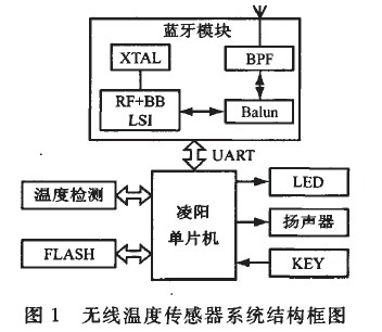 無線溫度傳感器主要由單片機(jī)控制單元、藍(lán)牙模塊、溫度檢測單元、接口電路及其它輔助電路組成,系統(tǒng)結(jié)構(gòu)如圖1所示。控制單元凌陽單片機(jī)為整個系統(tǒng)的核心,對檢測到的溫度數(shù)據(jù)進(jìn)行轉(zhuǎn)換、顯示、傳輸,外擴(kuò)4MBFLASH用于存儲程序和溫度數(shù)據(jù)。藍(lán)牙模塊包括藍(lán)牙芯片、放大器、非平衡變壓器(Balun)等,負(fù)責(zé)與藍(lán)牙控制終端進(jìn)行無線連接和數(shù)據(jù)傳輸,按鍵完成系統(tǒng)設(shè)置、復(fù)位等信息輸人,測量的溫度數(shù)據(jù)在傳輸?shù)娇刂平K端的同時在LED上顯示,并通過揚(yáng)聲器定時語音播報當(dāng)前溫度數(shù)據(jù)和超限報警。