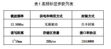 應(yīng)用方案中共涉及到高頻(13.56MHz)超高頻(915MHz)兩種不同類型的RFID標簽,所選擇的RFID標簽規(guī)格如表1、表2 所示。