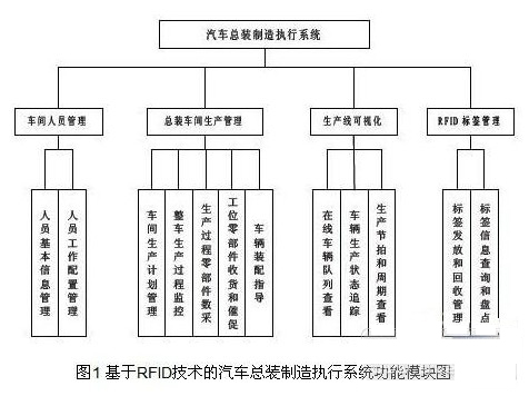 基于RFID技術(shù)的汽車總裝制造執(zhí)行系統(tǒng)功能模塊主要分為車間生產(chǎn)管理、生產(chǎn)線可視化、RFID標簽管理、車間人員管理等四個功能模塊,具體功能結(jié)構(gòu)如圖1 所示: