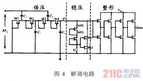 解調(diào)電路如圖4所示。M1~M4 為4級倍壓單元,起到檢波二極管的作用。由于并聯(lián)穩(wěn)壓電路的瀉流管無法瞬間關(guān)斷,因此,在OOK信號關(guān)斷時刻,瀉流管抽取電容C4上的電荷。電容C4取值較小,因此,p1點(diǎn)電平迅速下降,形成較大的下脈沖凹陷,經(jīng)過后級的整形電路,輸出標(biāo)準(zhǔn)的解調(diào)波形。