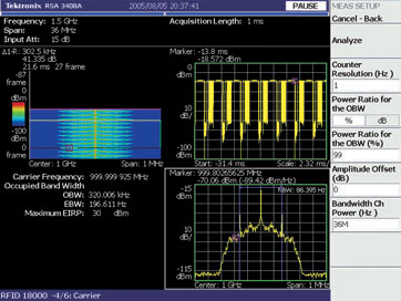 政府規(guī)定要求控制發(fā)射信號的功率、頻率、帶寬。這些規(guī)定防止有害干擾并保證每個發(fā)射者都是頻帶內(nèi)其他用戶的友好鄰居。對于許多頻譜分析儀特別是通常用于脈沖信號能量測量的掃頻頻譜分析儀,進(jìn)行此類測量是具有挑戰(zhàn)性的。RTSA 能夠分析一個完整的分組發(fā)射過程的能量特點(diǎn),也能直接測量跳頻信號的載波頻率,而無需將信號置于一個跨度的中心。按一下按鍵,分析儀就能識別一個瞬時 RFID 信號的調(diào)制方式并能夠?qū)β省㈩l率和帶寬進(jìn)行監(jiān)管測量,使預(yù)一致性(pre-compliance)測試過程變得非常靈活和方便 [參閱圖2]。預(yù)一致性測試有助于確保產(chǎn)品一次通過一致性測試,而無需重新設(shè)計和重新測試。