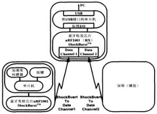 nRF2402是單片2.4 ~2.5GHz射頻發(fā)射芯片, 發(fā)射器包含頻率合成器、功放、晶體振蕩器和調(diào)制器 ,輸出功率和信道選擇很容易通過3-線接口編程實現(xiàn), 在輸 出功率為-5dBm時電流消耗僅10mA ,內(nèi)置的ShockBurst技術(shù)以及休眠模式用來降低發(fā)送數(shù)據(jù)的電流消耗 ,以延長電池使用壽命 ,并且向pc發(fā)送的數(shù)據(jù)包也應(yīng)盡可能少(取采樣速率為100采樣點/秒)。ShockBurst技術(shù)使用片內(nèi)先入先出堆棧(FIFO)低速處理數(shù)據(jù)(10Kbps)而高速發(fā)送數(shù)據(jù)(1Mbps)。