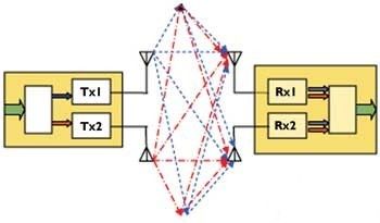 通過使用多路傳輸方式,在每個接收天線上采用空間微分技術(shù),使得DSP能夠進行信號分離并恢復(fù)原始的兩路數(shù)據(jù)流。使用相同射頻信道的獨立發(fā)射器,在它們各自的天線上發(fā)送出獨立的數(shù)據(jù),然后,接收天線匯集所有發(fā)射器的復(fù)合信號。通過巧妙設(shè)計的MIMO報文和先進的DSP,就可以恢復(fù)出獨立的數(shù)據(jù)流。數(shù)據(jù)速率與發(fā)射器和天線數(shù)量之間具有幾乎線性的關(guān)系,速率的提高并不需要增大信道帶寬。