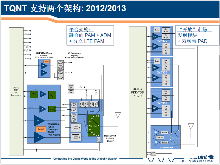 對于多頻多模的3G/4G手機,針對射頻前端器件的設(shè)計如何實現(xiàn)集成?熊挺表示,目前有兩種方案:一種是融合架構(gòu),將不同頻率的射頻功率放大器PA集成;另一種架構(gòu)則是沿信號鏈路的集成,即將PA與雙工器集成。兩種方案各有優(yōu)缺點,適用于不同的手機。融合架構(gòu),PA的集成度高,對于3個以上頻帶巨有明顯的尺寸優(yōu)勢,5-7個頻帶時還巨有明顯的成本優(yōu)勢。缺點是雖然PA集成了,但是雙工器仍是相當(dāng)復(fù)雜,并且PA集成時有開關(guān)損耗,性能會受影響。而對于后一種架構(gòu),性能更好,功放與雙功器集成可以提升電流特性。所以TriQuint可以提供兩種架構(gòu)的方案,大于6個頻段時(指3G和4G)采用融合架構(gòu),而小于四個頻段時采用PA與雙工器集成的方案PAD。