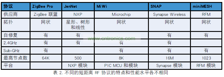 使用芯片制造商開(kāi)發(fā)的專(zhuān)有協(xié)議可免去 ZigBee 許可證費(fèi)(見(jiàn)表 2)。 NXP 提供 JenNet 協(xié)議,該協(xié)議在 2.4GHz 波段內(nèi)運(yùn)行,能組建樹(shù)狀、星狀和線(xiàn)性自修復(fù)網(wǎng)絡(luò),最高包含500 個(gè)節(jié)點(diǎn)。 Microchip 的免費(fèi) MiWi 堆棧同時(shí)以 sub-GHz和 2.4GHz 兩種頻率,在 PIC 微控制器和 Microchip 收發(fā)器上運(yùn)行。