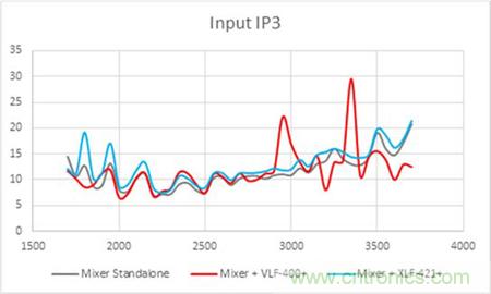 同樣的,在IP3的測試曲線也顯示了混頻器輸出端配對傳統(tǒng)濾波器后導(dǎo)致的不穩(wěn)定曲線。而使用無反射式濾波器配對混頻器的輸出端則使得IP3性能與混頻器本身的IP3性能保持一致。