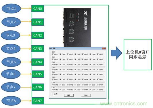 若將每個節(jié)點單獨取出做測試,則必然破壞原有通信規(guī)則。如何在不破壞原有通信的基礎(chǔ)上搞清楚一個陌生的收發(fā)協(xié)議呢?所謂工欲善其事,必先利其器。您需要一個能同時收發(fā)、轉(zhuǎn)送多路CAN數(shù)據(jù)的CAN卡,USBCAN-8E-U正是為這種應(yīng)用而生。