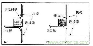 屏蔽連接器方法有,加指形簧片或墊片。連接器的搭接,是在連接器和機(jī)殼之間填滿(mǎn)空處。這個(gè)方法要求有一個(gè)襯墊(圖2A)。金屬襯墊較好,只要處理合適,也就是說(shuō),只要表面不被污染,只要手不觸及或損壞襯墊以及只要有足夠的壓力,以保持好的、低阻抗的接觸。