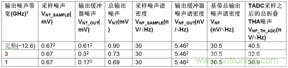 在采樣過程中,下游ADC將輸入帶寬(表1和表2中所示的濾波和ADC輸入帶寬的組合)上的所有THA噪聲外差到一個ADC奈奎斯特區(qū)間。因此,總折疊噪聲是ADC噪聲帶寬上的總THA輸出放大器時域噪聲的一部分。