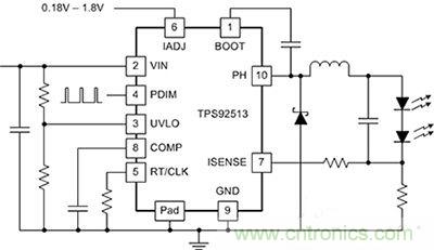 圖 2: TPS92513/HV LED 驅(qū)動器典型應(yīng)用的簡化原理圖。