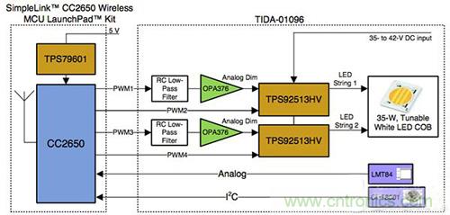 SimpleLink CC2650 無線 MCU 與 LED 驅(qū)動器緊密協(xié)作,提供了兩個關(guān)鍵功能:驅(qū)動器的控制信號,以及以無線方式影響這些信號的功能。這樣,便可以從智能手機(jī)上運(yùn)行的應(yīng)用程序中調(diào)節(jié)光輸出或色溫,或者允許 BMS 將燈關(guān)閉、打開、調(diào)亮或調(diào)暗 — 可能使用語音指令。