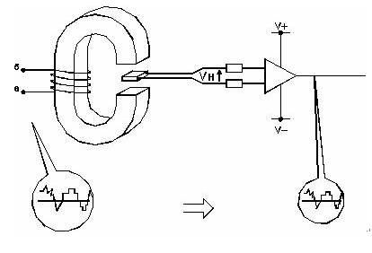 圖1.位于磁性電路間隙中的霍爾發(fā)生器把一次電流產生的磁場轉換成成比例的霍爾電壓
