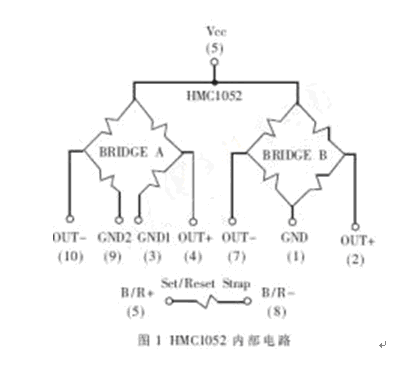 HMC1052是一個雙軸線性磁阻傳感器,每個傳感器都有一個由鐵鎳薄膜合金組成的惠思頓橋。當橋路加上供電電壓時,傳感器將磁場強度轉化為電壓輸出。HMC1052包含兩個敏感元件,它們的敏感軸相互垂直,且參數(shù)相互匹配。內部電路如圖1所示。