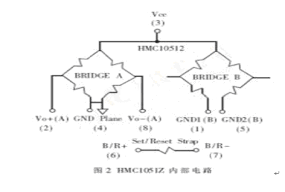 HMC1051Z為HMC1052的單軸版本,其參數(shù)與HMC1052相同。HMC10512內部電路如圖2所示。