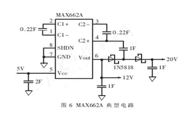 在HMC1055芯片上,置位/復位片的引腳名稱是S/R+和S/R-,沒有極性的區(qū)別,單個置位/復位帶標準阻值為2.0Ω,所以對于三軸系統(tǒng),三個金屬片串聯(lián)阻值為6.0Ω,則產生一個3~4A的最小脈沖驅動一個6Ω的負載所需的供電電壓為18V~24V。由于系統(tǒng)芯片都是使用5V電源,所以需要將5V電壓升壓到20V左右,可以使用MAX662來完成。典型的電路如圖6所示。
