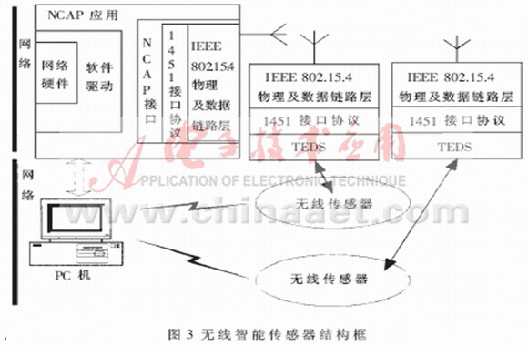 無線傳感器網(wǎng)絡主要由完成NCAP功能的PC主機和無線傳感器終端模塊組成,體系結(jié)構如圖3所示。各傳感器終端之間可以互訪,并可通過接入點與有線網(wǎng)上的設備交換數(shù)據(jù),甚至可以再次通過有線網(wǎng)上的另一個接入點與遠端的設備互通信息。在這種情況下,無線成為有線的延伸和補充,一般用于需要經(jīng)常移動傳感器的地方,或線纜密集不宜再度布線的地方。