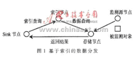 (4)基于索引的數(shù)據(jù)分發(fā)方案(index-based data dissemination scheme)[3],這種方案克服了以上幾種方案存在的問(wèn)題。在這種方案中,負(fù)責(zé)監(jiān)測(cè)某對(duì)象的源節(jié)點(diǎn)定期產(chǎn)生該監(jiān)測(cè)對(duì)象的感知數(shù)據(jù),并存儲(chǔ)到存儲(chǔ)節(jié)點(diǎn)上,存儲(chǔ)節(jié)點(diǎn)可能是該源節(jié)點(diǎn),也可能是鄰近的某個(gè)節(jié)點(diǎn)。同時(shí),存儲(chǔ)節(jié)點(diǎn)的位置信息(稱為索引),要增加到索引節(jié)點(diǎn)上。當(dāng)sink節(jié)點(diǎn)想查詢某個(gè)被監(jiān)測(cè)對(duì)象產(chǎn)生的感知數(shù)據(jù)時(shí),就發(fā)送一條查詢消息給有關(guān)的索引節(jié)點(diǎn),索引節(jié)點(diǎn)收到該消息后轉(zhuǎn)發(fā)查詢請(qǐng)求給相應(yīng)的存儲(chǔ)節(jié)點(diǎn),由存儲(chǔ)節(jié)點(diǎn)直接發(fā)送查詢結(jié)果給sink節(jié)點(diǎn)。其基本思想如圖1所示。這種數(shù)據(jù)分發(fā)方案避免了發(fā)送不需要的感知數(shù)據(jù),也不需要把控制信息泛洪到整個(gè)網(wǎng)絡(luò),改善了整個(gè)系統(tǒng)的性能,但是增加了維護(hù)索引節(jié)點(diǎn)的額外費(fèi)用。