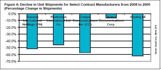 除了這些廠商縮小外包以外,摩托羅拉和索尼愛立信市場份額下降,也波及到整個產(chǎn)業(yè)鏈,影響到其制造伙伴。這兩家公司是嚴(yán)重依賴合同制造商的一線OEM廠商。