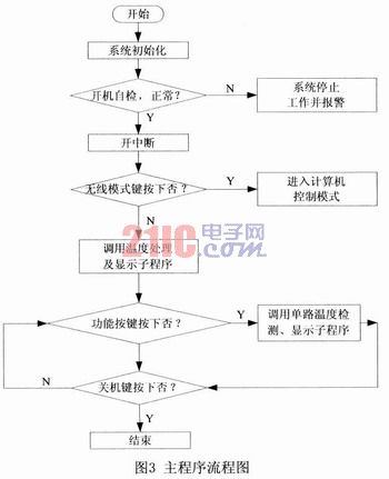 系統(tǒng)上電后單片機(jī)首先進(jìn)行系統(tǒng)初始化,之后程序執(zhí)行相應(yīng)的自檢子程序,檢測測溫系統(tǒng)是否有故障。系統(tǒng)默認(rèn)進(jìn)入的單機(jī)工作模式,在單機(jī)工作模式下,可以根據(jù)功能按鍵選擇不同的功能,通過系統(tǒng)調(diào)用相應(yīng)的功能按鍵處理子程序來完成應(yīng)的功能,并在LED數(shù)碼管上顯示相應(yīng)的溫度信息,具有非常好的人性化特點;在無線工作模式下,此時系統(tǒng)作為一個下位機(jī),可以和遠(yuǎn)程計算機(jī)進(jìn)行無線通信,實現(xiàn)數(shù)據(jù)的遠(yuǎn)距離傳輸,利用計算機(jī)強(qiáng)大的信息處理功能,把下位機(jī)傳送過來的數(shù)據(jù)進(jìn)行分析和處理。