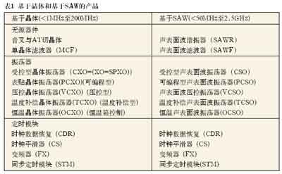 在有線與無(wú)線市場(chǎng)迅猛增長(zhǎng)的推動(dòng)下,石英晶體及其高頻版SAW器件正廣泛用于各個(gè)領(lǐng)域,小到電子玩具中簡(jiǎn)單的無(wú)源石英晶體,大到用于最先進(jìn)的電信網(wǎng)絡(luò)骨干網(wǎng)定時(shí)的復(fù)雜同步定時(shí)模塊(STM),如表1所示。