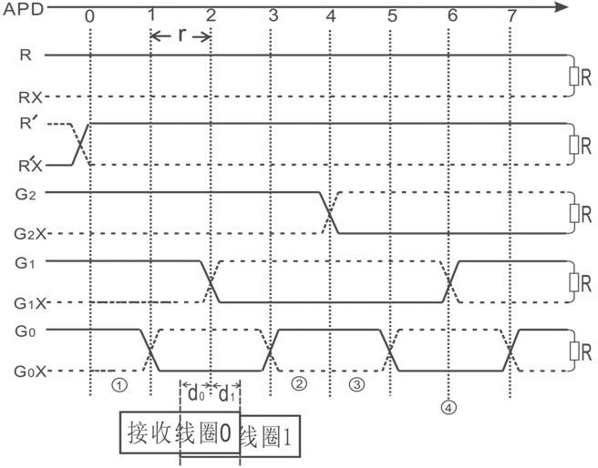 在t0、t1、t2、t3、t4時間段,分別向傳輸對線R、R’、G2、G1、G0發(fā)送載波信號,在t5時間段不發(fā)送。車上天線箱中有兩個接收線圈:接收線圈0和接收線圈1。APD檢測是從接收線圈0感應(yīng)信號的相位中得到APD位置。在t0時間段,線圈0感應(yīng)的是R線發(fā)送的信號,稱為R信號;在t1時間段,線圈0感應(yīng)的是R’信號,R’信號與R信號反相,記為=1,作為起始位;在t2時間段,線圈0感應(yīng)的是G2線發(fā)送的信號,G2=0或1,取決于接收線圈0的位置。若接收線圈0的中線分別在①、②、③、④的位置,則接收線圈0的接收信號的相位如圖3所示。