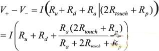 阻性屏幕中的兩點(diǎn)觸摸檢測(cè)模型如圖 2 所示。Rtouch為層間的接觸電阻;在現(xiàn)有的大多數(shù)屏幕中,其數(shù)量級(jí)一般與兩層的電阻相同。如果有一個(gè)恒定的電流I流經(jīng)有源層的兩端,則有源層上的電壓為: